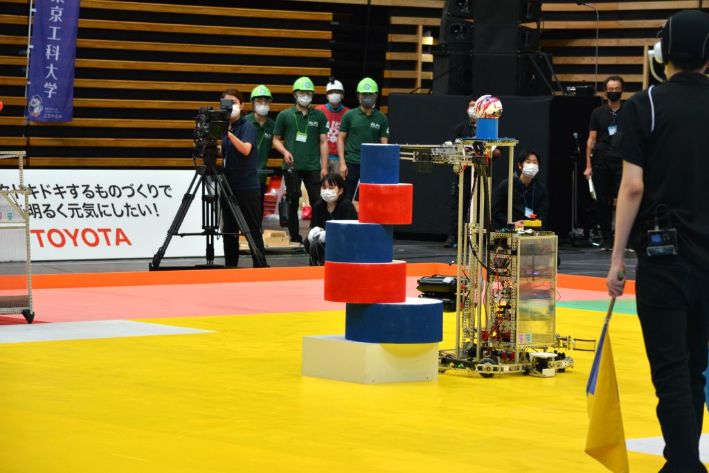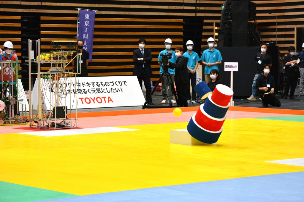 続くラウンド2。都立大は開始6秒、初球でブレイクショット成功!ラゴリの塔は崩れたが、1枚だけ台に重なった状態のままだ。ラゴリブレイクは「フィールドに接している」ことが条件となるため、ブレイク成功と見なされるのは4枚(20点)となる。千葉大、都立大ともに、思うようにマシンを動かせていないように見える。90秒のラウンドが終了してパイル成功は1枚。両ラウンドとも、両ラウンドとも、大勢の観客の中でマシンを手動で操縦する緊張感からか、なかなか難しい試合展開となった。得点:30