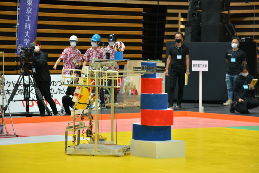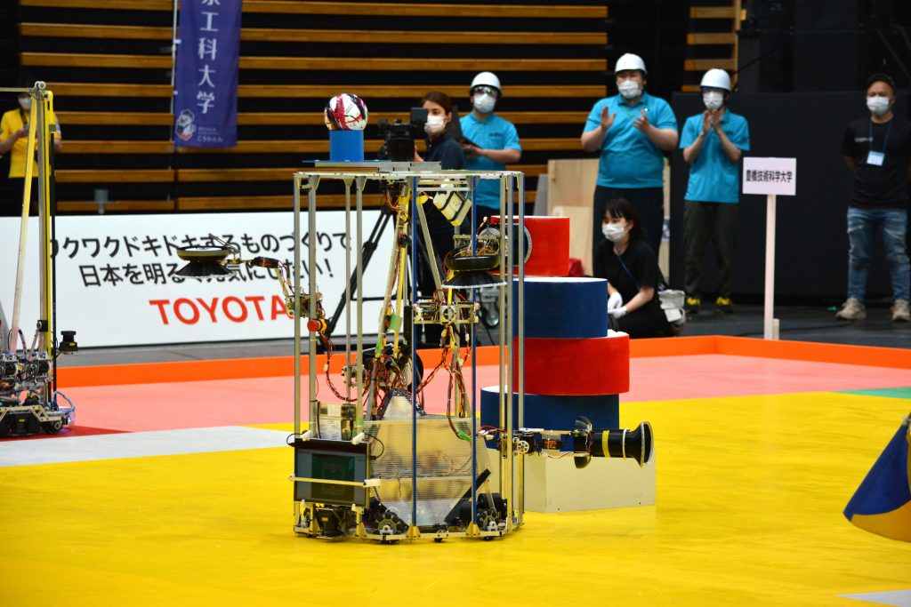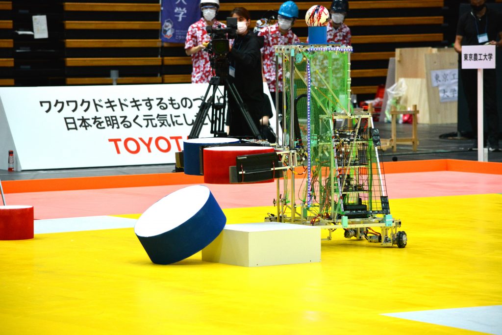 ブレイクショットタイム終了後は残った時間を使ってラゴリパイルをする。富山大はヒッターボールを取りに行くがリトライに入り、その隙に農工大のR2がどんどんとパイルを進める。1分過ぎにようやくヒッターボールを打ち出すがボールオンヘッド(以下、BOH)には当たらず、農工大がパーフェクトラゴリを決めた。BOHを頭上で回して防御する機構が狙いにくそうだ。得点:75