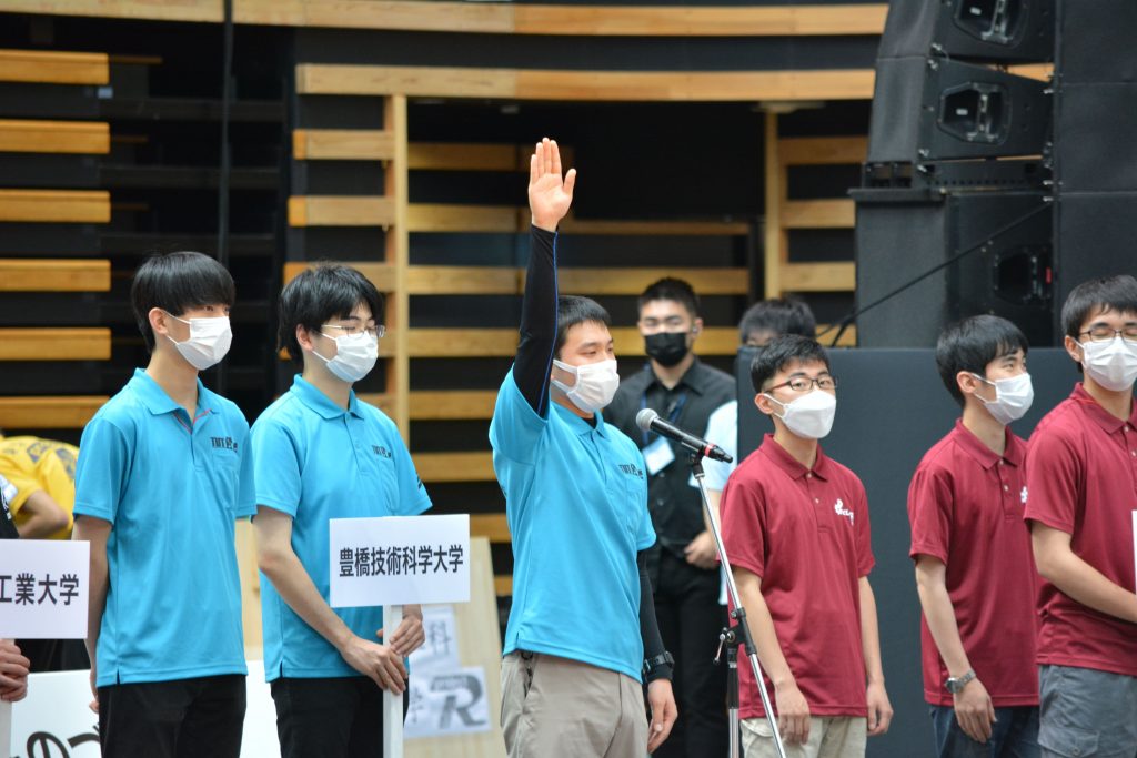 選手宣誓は豊橋技術科学大学の楠原さん。実況席はおなじみ、東大OBのレジェンドロボコニスト、河村さんと藪内さんだ。