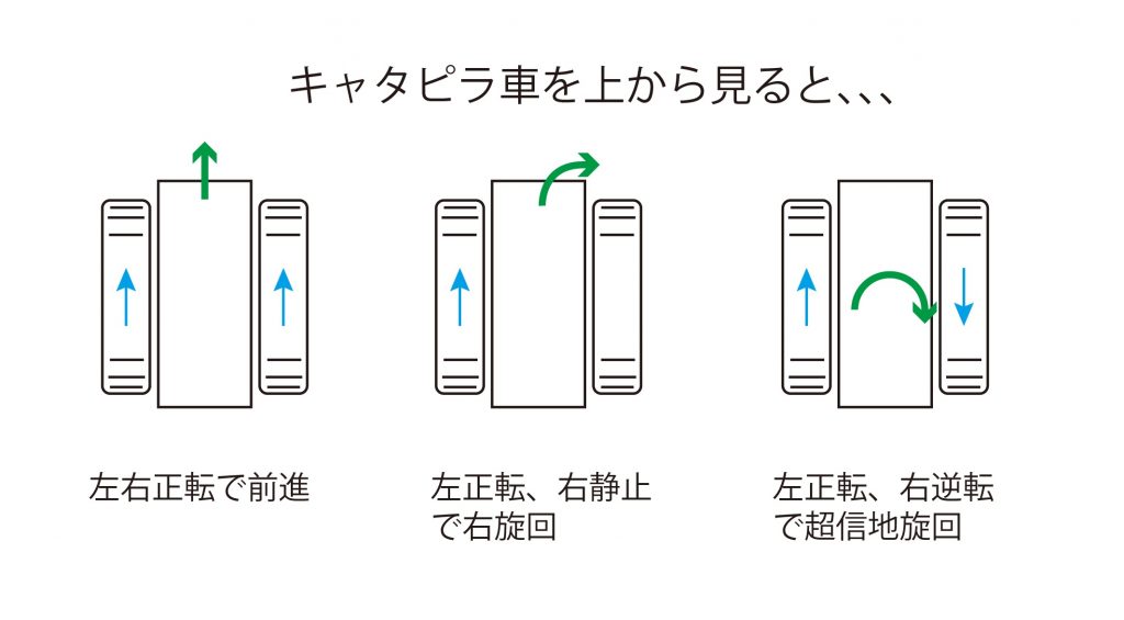 クローラーはいわば一列に並んだ車輪にベルトを巻き、接地面積が車輪よりも多くなることで、悪路も難なく走ることができます。曲がるときには左右それぞれの駆動を緩める、あるいは止めることで右左折しますが、それぞれを逆回転させればその場でクルクルと車体を回転させることもできます。