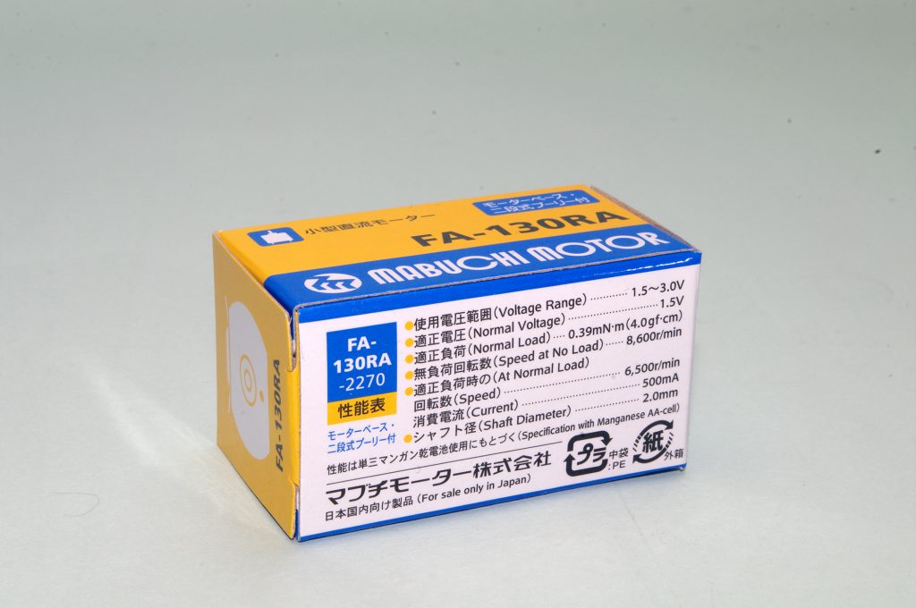 Arduinoの直接出力では模型用モータを駆動させることはできません。例えばマブチモーターさんのFA-130モータを例にとっても、パッケージには消費電流として500mAという電流値が表示されています。