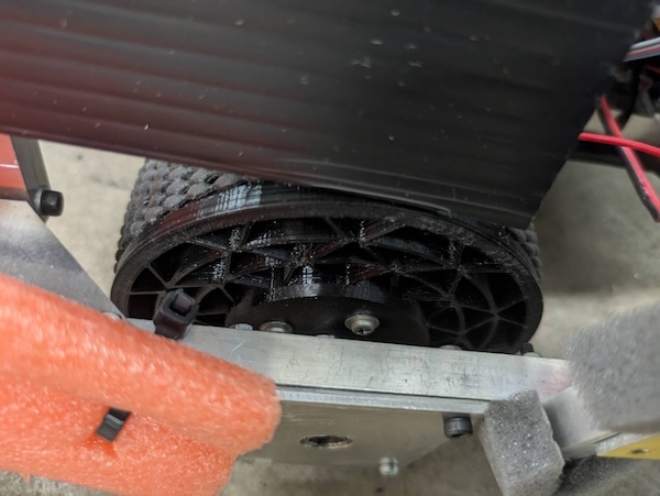 ロボットを飛ばして着地させるのは初めての試みで、技術のノウハウがなかったため、過去の大会を参考にしようとしましたが適切な例が見つからず、手探りでやっていくしかないと覚悟を決めました。機械班のメンバーでひたすら試作と実験を繰り返し、納得のいく結果が得られるまで改良を続けました。具体的には、TPU製(可塑性樹脂)のフィラメントでタイヤを自作し、衝撃を吸収するアイデアが生まれました。