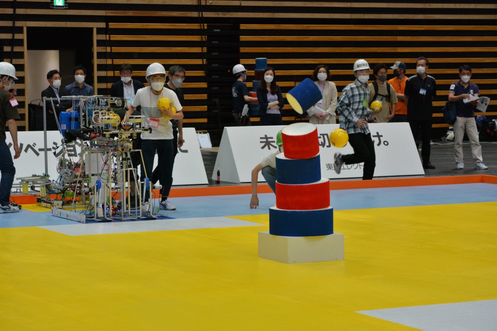 スタート直後、ボール回収に向かったR1がバランスを崩して転倒しかける。背が高く重心も高い位置にあるため、床材の「すべり」が変われば起きやすい問題だろう。R2のディスク回収は順調だ。マシン内部で積み上げてからパイルするタイプで、完成したタワーが美しい。BOHはR2の中心位置からずらした位置に置いてあり、狙いにくくなっている。ただし、その分落下はしやすそうだ。
