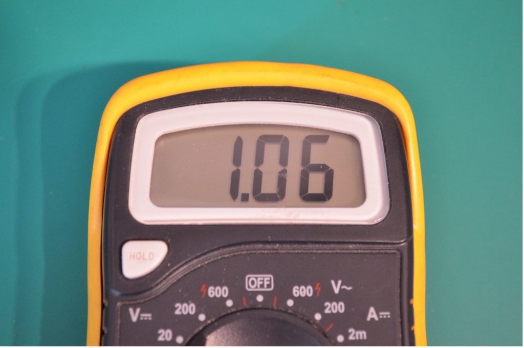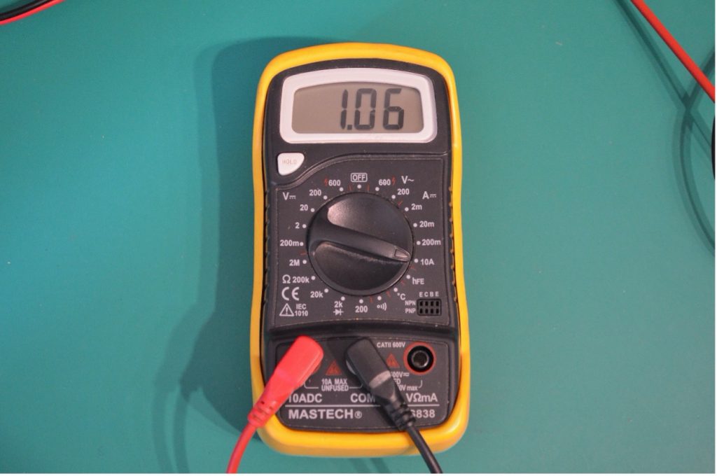 10Aのレンジに合わせて計測。1.06[A]が表示されている。