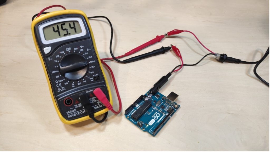 クリップにテスターのテスト棒を接続し、ACアダプタからArduinoへ供給されている電流値を計測している。