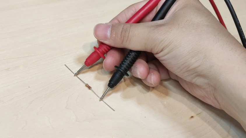 ②テスターのテスト棒2本(赤色・黒色)をそれぞれ、測定対象の抵抗器の両端の足に接触させます。