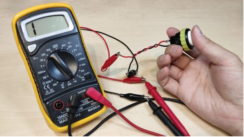 今回はスイッチのON/OFFの導通チェックをします。なお、「1」はテスト棒が非接触時に表示されているもので、、電源OFFでないことをわかりやすくするために表示しているものと思われます。他の種類のテスターでは「OL.」と表示されるものも多くあります