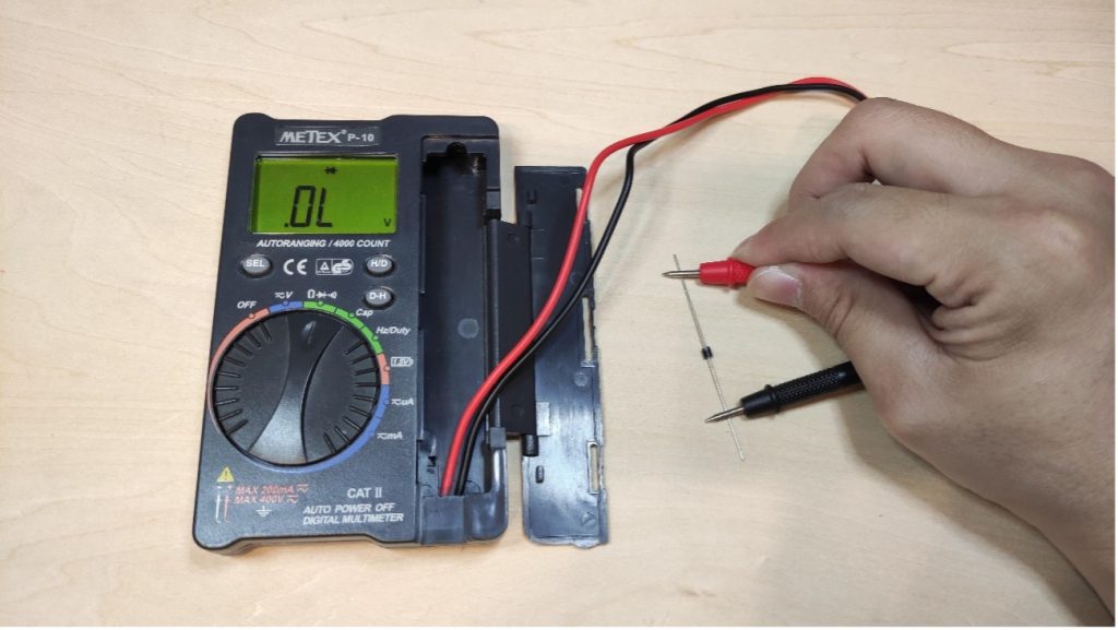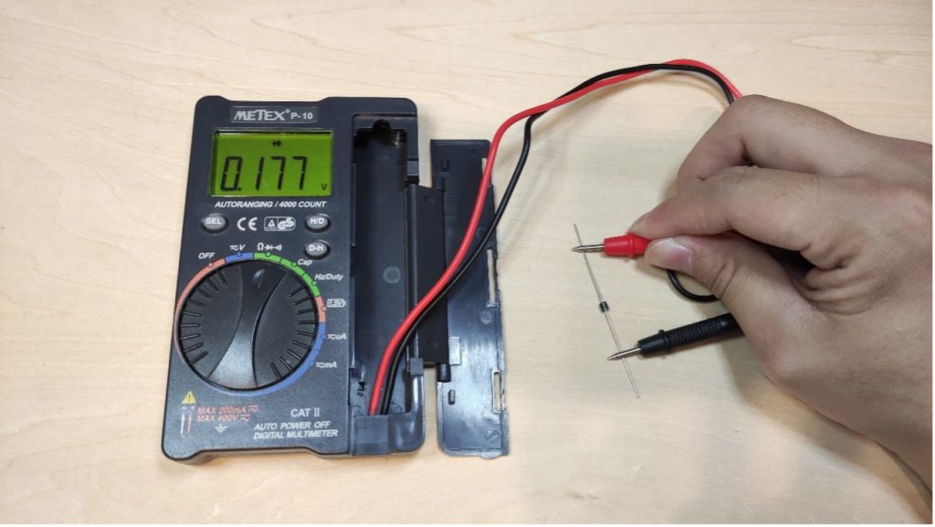 テスト棒の赤をアノードに、黒をカソードに接続。ダイオードの順方向電圧が表示されている。
