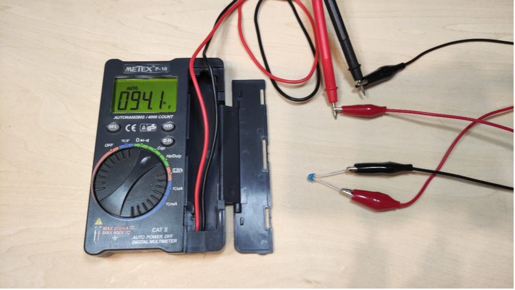 テスターによってはコンデンサなどの静電容量(単位は[F]ファラド)を測定することができます。テスターで静電容量を測定する前に、コンデンサ内に溜まっている電荷を完全に放電する必要があるため、必ず適切な抵抗でコンデンサの両端子を接続して完全に放電させましょう。また、測定時はテスターのテスト棒とコンデンサの端子を接触させるときに指でつまむと人体が電気的に影響してしまうため、みの虫クリップなどで挟んで指は触れない状態で測定しましょう。