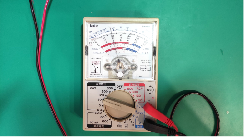 アナログテスターの指針。30[V]のレンジで10[V]が示されている。